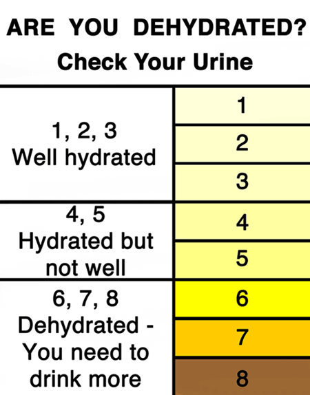 Urine in a toilet is diluted and its color changes relative to the amount of water in the bowl, which can vary between toilets significantly dehydration urine color chart. Dehydration urine color chart the following dehydration urine color chart will help you use your urine color as an indicator of your level of dehydration and what actions you should take to help return your body back to a normal level of hydration.